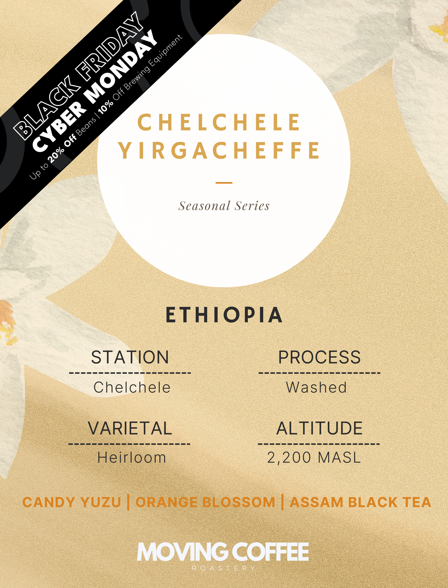 Enjoy the classic profile of a Yirgacheffe coffee, where aroma of Assam Black tea rise alongside the sweetness of brown sugar. Acidity of Yuzu nicely sits well behind the sugary notes, lifting the tasting notes and adding complexity and depth.