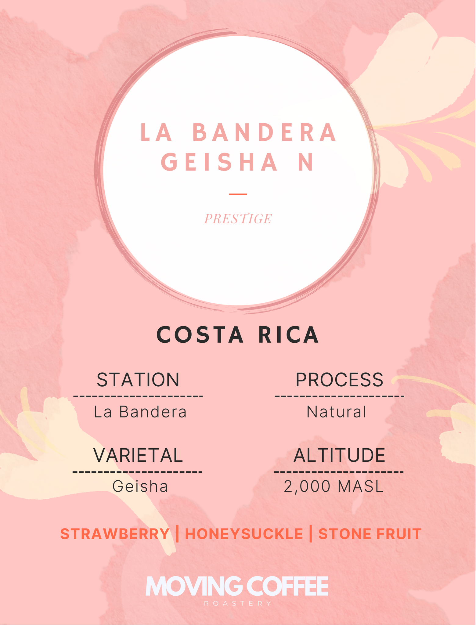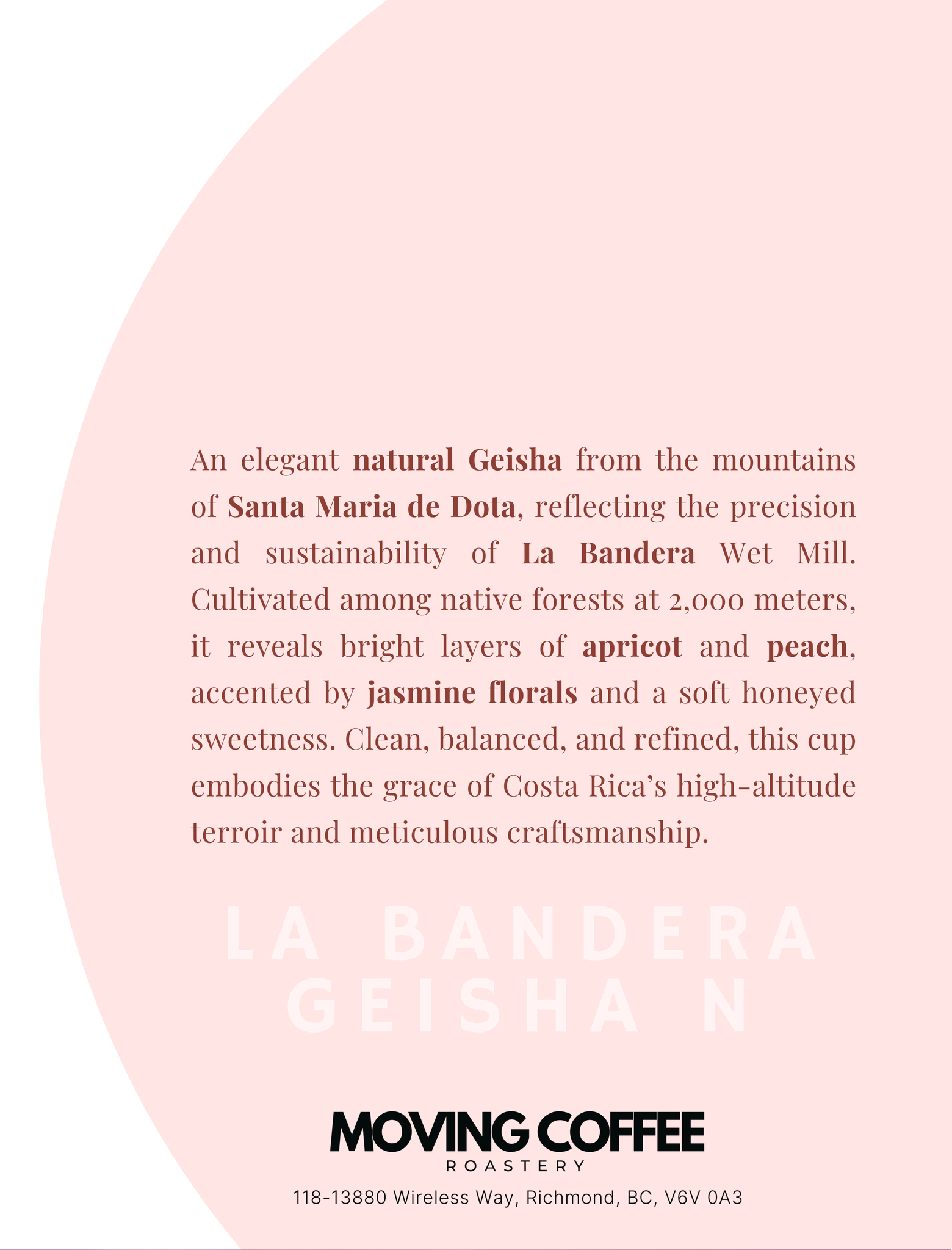 An elegant Geisha Washed from the mountains of Santa Maria de Dota, reflecting the precision and sustainability of La Bandera Wet Mill. Cultivated among native forests at 2,000 meters, it reveals bright layers of apricot and peach, accented by jasmine florals and a soft honeyed sweetness. Clean, balanced, and refined, this cup embodies the grace of Costa Rica’s high-altitude terroir and meticulous craftsmanship.