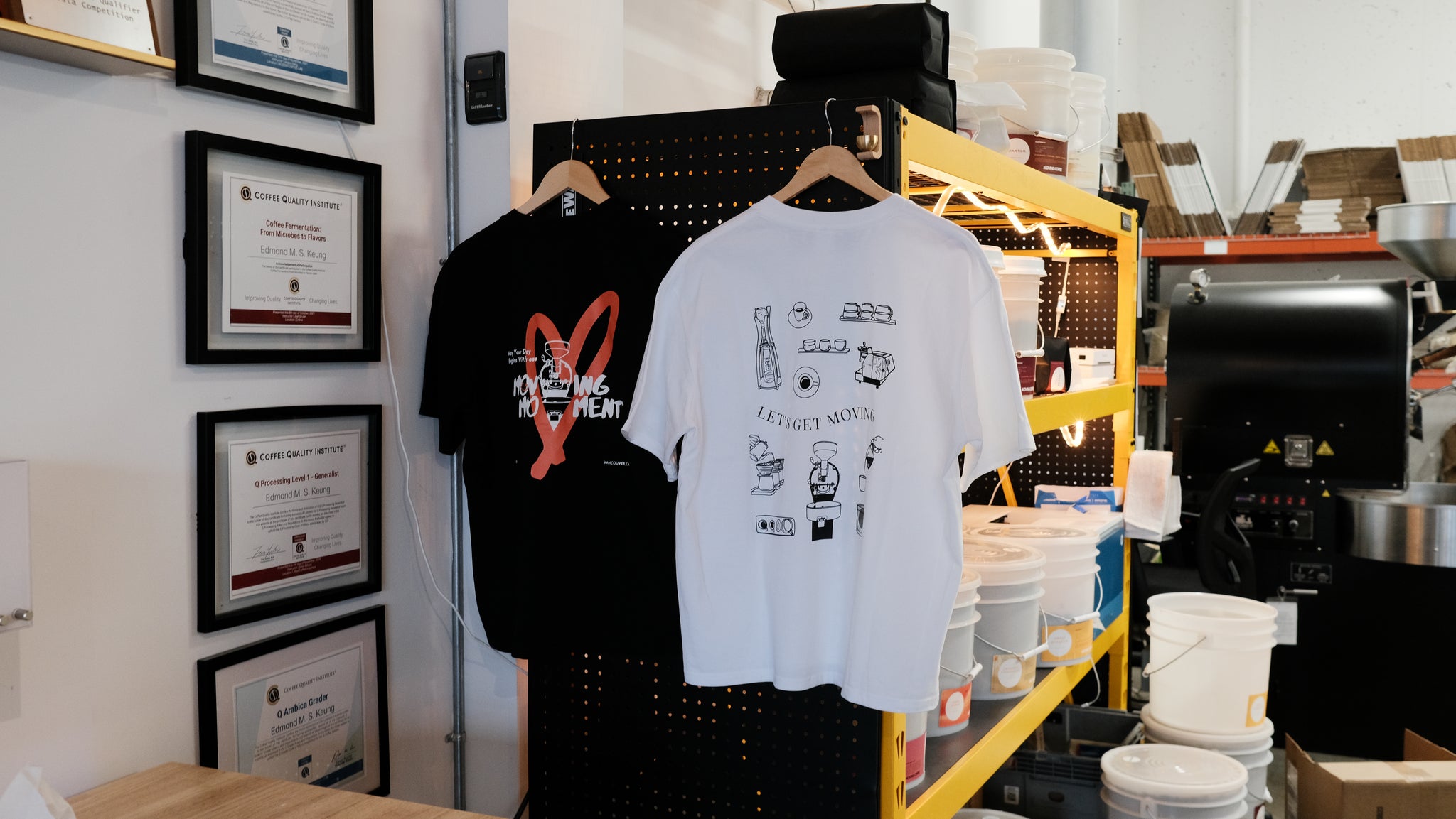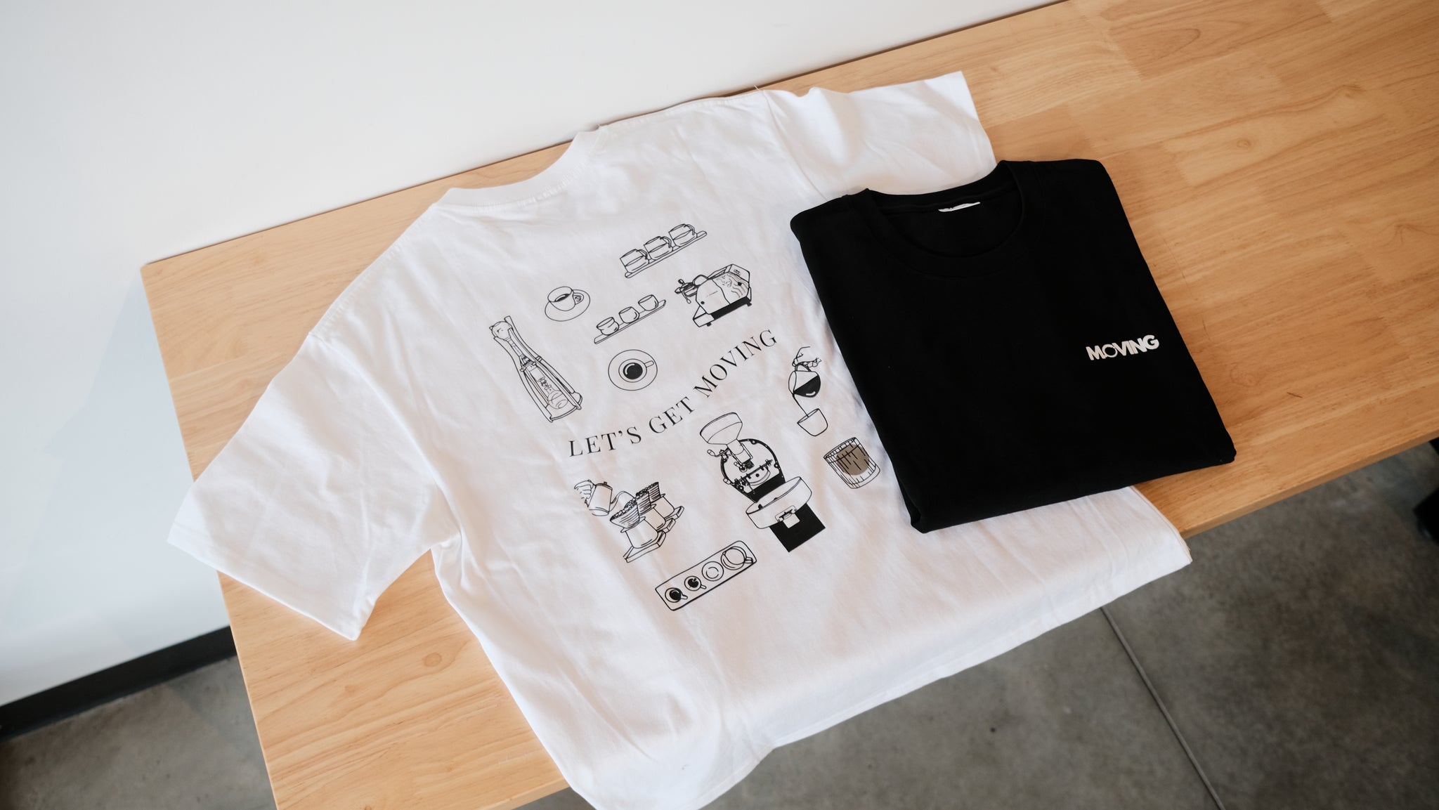 "Let's Get Moving" (White/Black) - Showcasing the essential tools of our craft through elegant line illustrations. From portafilters to espresso machines, this design celebrates the equipment that brings our specialty coffee to life. Available in classic white with detailed artwork or sleek black with minimal branding.
